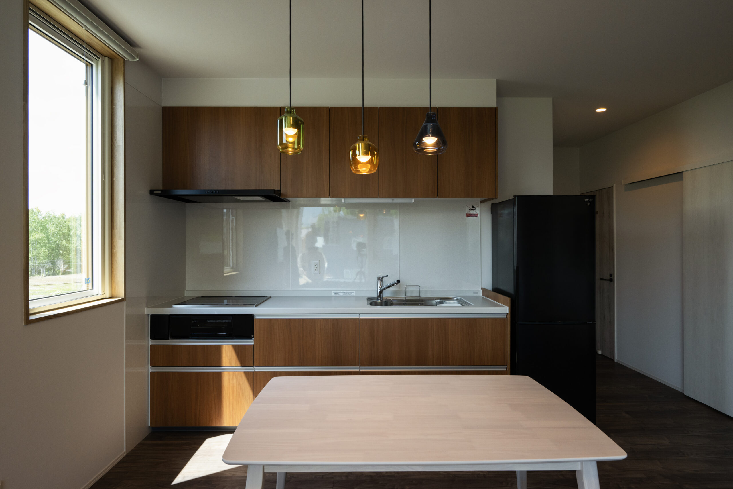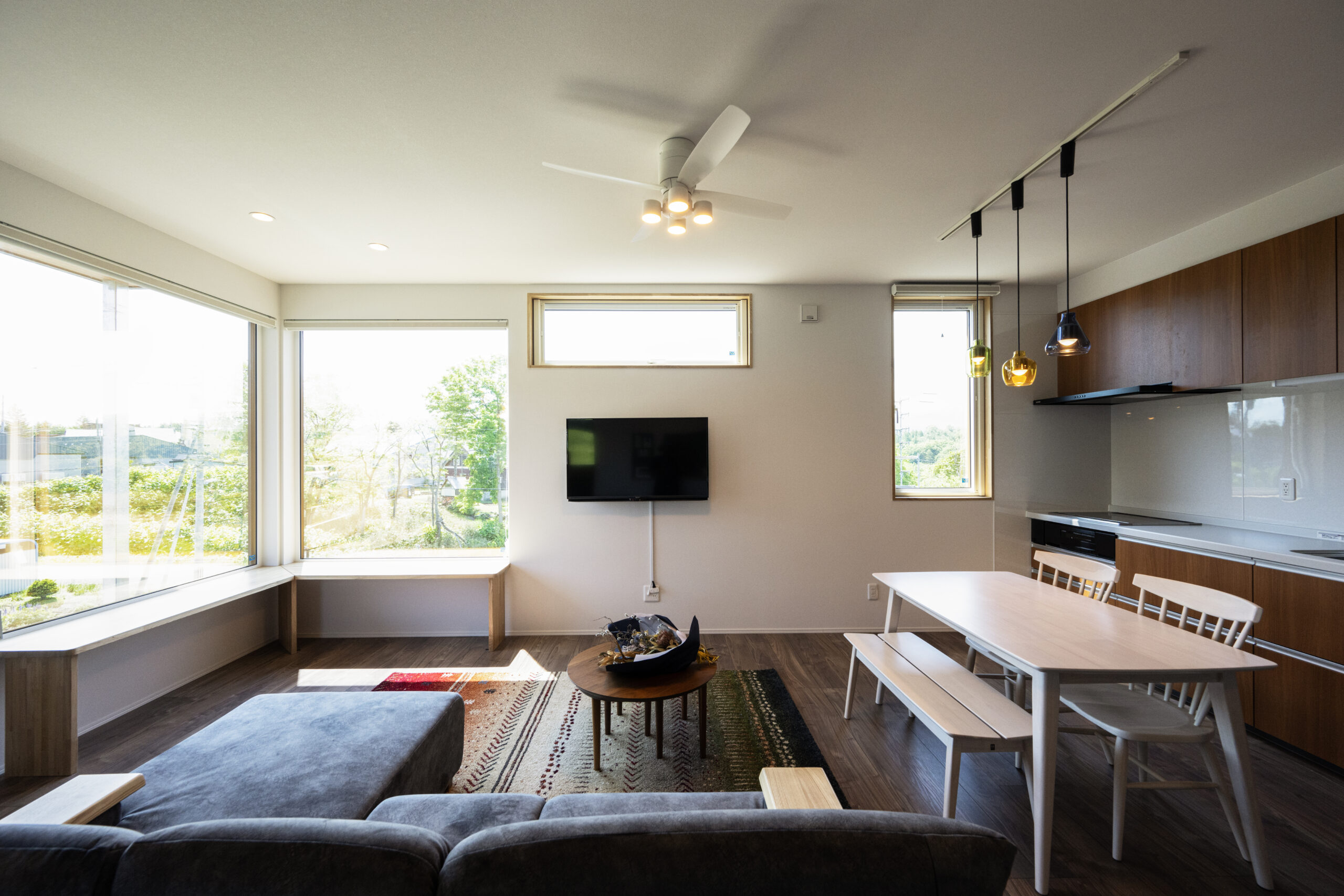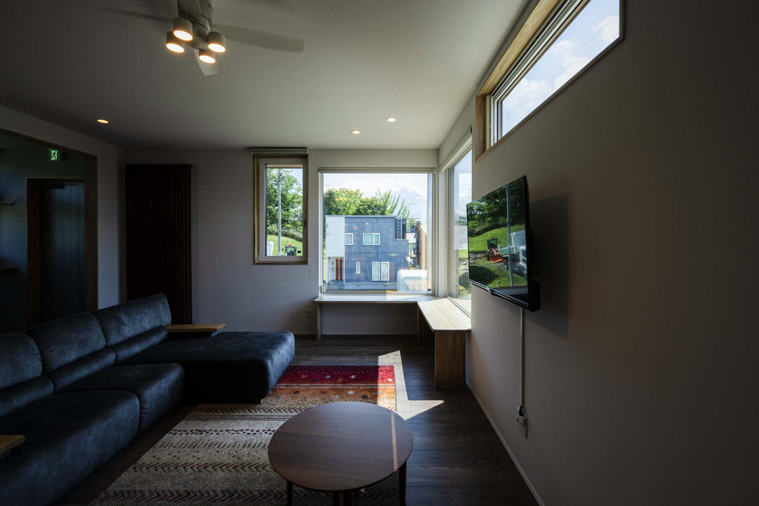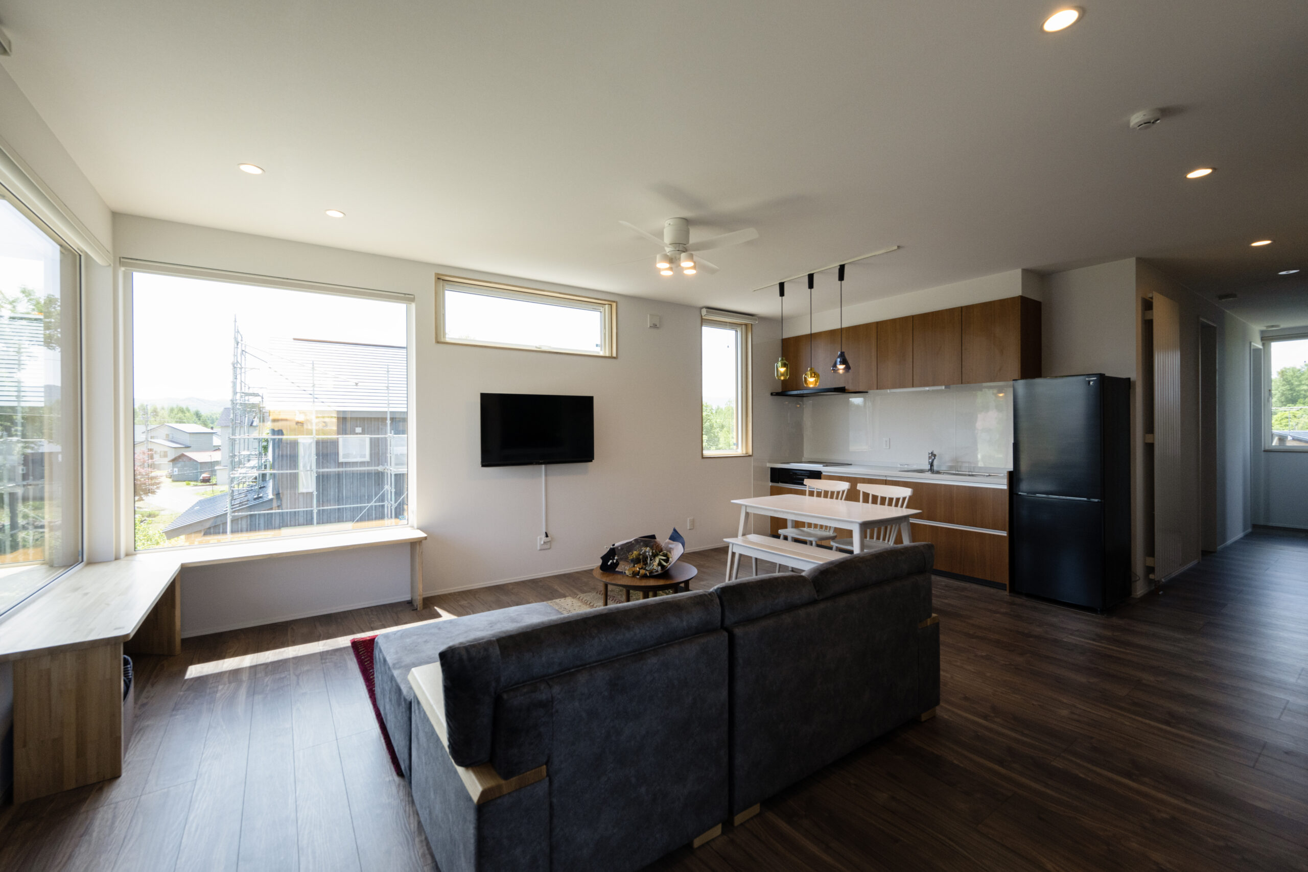 寝室3室、5ベッド、1シャワールームの定員6名の3LDK一棟貸しです。大きい窓から羊蹄山も望む明るいリビングルームは、ソファー、大型テレビを備えゆっくりおくつろぎいただけます。充実したキッチンはIHシステムキッチン、冷蔵庫、調理器具、レンジ、トースター、炊飯器、食器等を備え、本格的な調理ができます。また洗濯機、乾燥室等もありWifi完備で長期滞在にも適してます。さらに、トランポリン、スケートボードミニランプも無料でご利用いただけます。